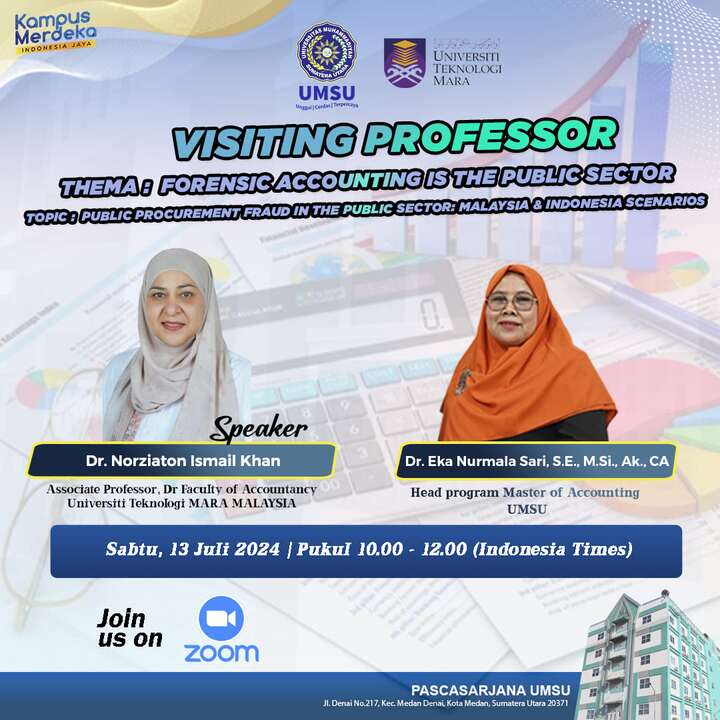 Untuk memenuhi hal tersebut dan sebagai bagian dari kerjasama pendidikan Universitas Muhammadiyah Sumatera Utara (UMSU) maka Program Studi Magister Akuntansi Pascasarjana UMSU bersama Program Master Accountancy University Technologi Mara Malaysia melaksanakan kegiatan Visiting Professor untuk mata kuliah Akuntansi Sektor Publik pada Semester genap TA 2023-2024 yang dilaksanakan pada tanggal 29 Juni dan 13 Juli 2024.